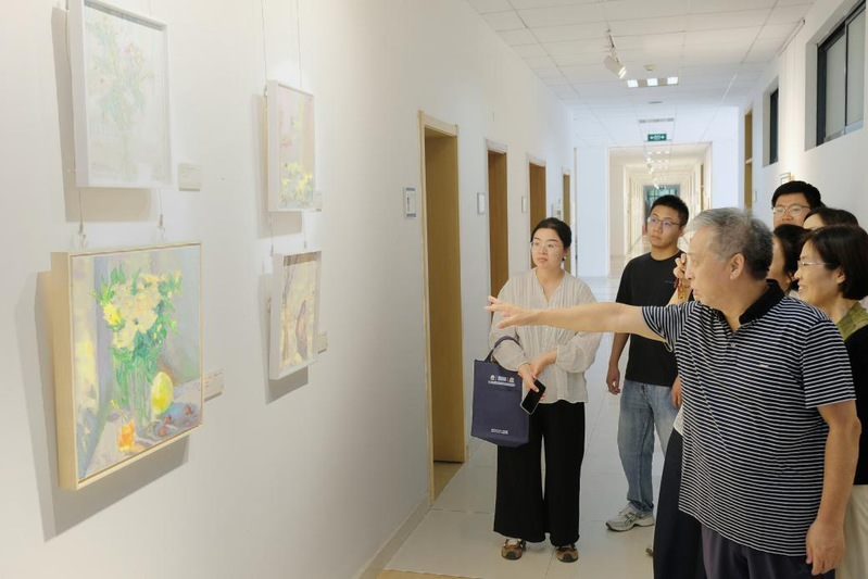 随后,陈敏建教授在威尼斯官网文化长廊与同学们开展画展交流,陈老师介绍重点了各幅画作的创作背景、灵感来源及艺术语言,与同学们分享了创作故事与感悟。同学们积极提问,与陈老师就创作灵感、水利元素在绘画中的呈现方式等话题展开热烈交流,进一步加深了对水利文化与艺术融合的理解。