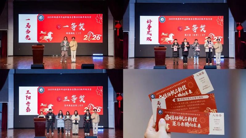 最后,同学们手持寓意吉祥的“福”字,以班级为单位依次登台合影。这一张张满载祝福的合影,不仅为此次年级大会画上了圆满的句号,更凝聚了共识,开启了新学期奋发向前的新篇章。这场大会既是对2025年全体师生共同耕耘与收获的一次深情回望,也是面向2026年崭新征程的郑重启航。愿我们带着这份汇聚的“福”气与共识,在新的一年里同心同行,携手书写更加精彩的成长篇章。